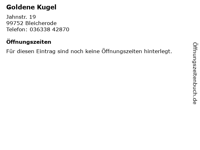 | Öffnungszeiten Goldene Kugel in Bleicherode anzeigen | |