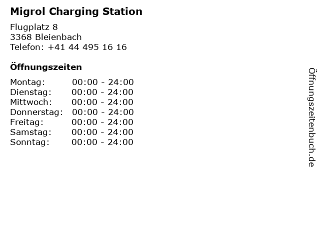 | Öffnungszeiten Migrol Charging Station in Bleienbach anzeigen | |