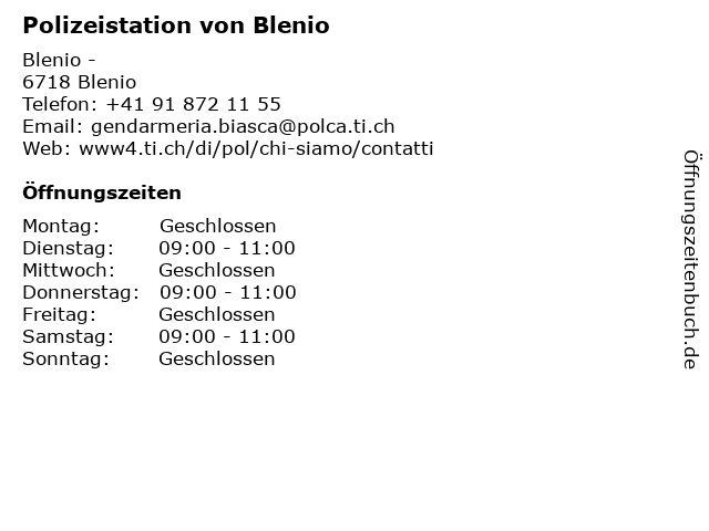 | Öffnungszeiten Polizeistation von Blenio in Blenio anzeigen | |