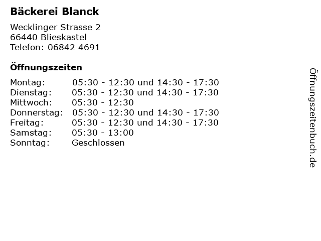 | Öffnungszeiten Bäckerei Blanck in Blieskastel anzeigen | |