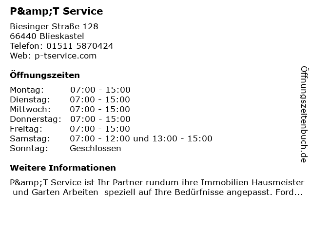 | Öffnungszeiten P&T Service in Blieskastel anzeigen | |
