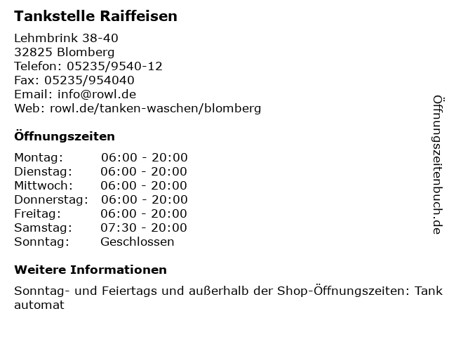 | Öffnungszeiten Tankstelle Raiffeisen in Blomberg anzeigen | |