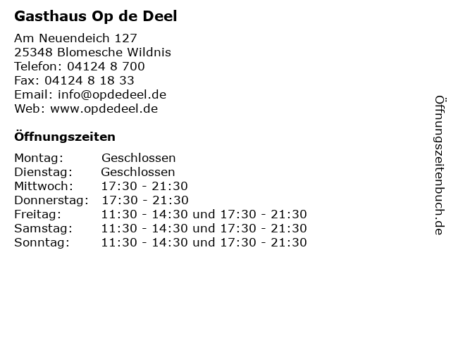 | Öffnungszeiten Gasthaus Op de Deel in Blomesche Wildnis anzeigen | |