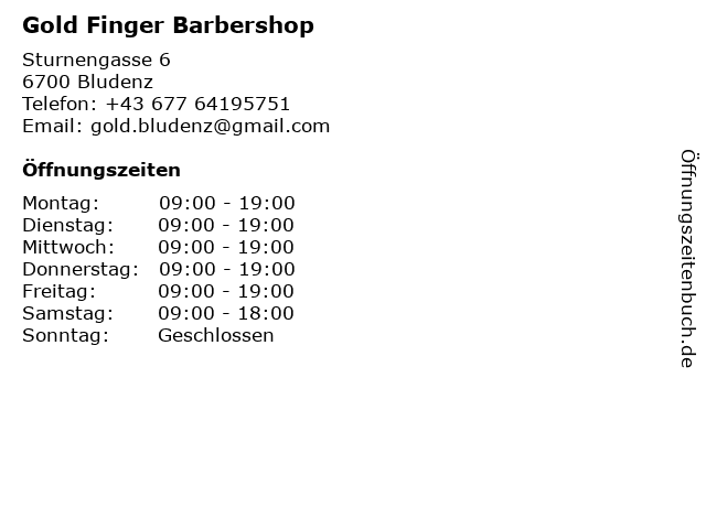 | Öffnungszeiten Gold Finger Barbershop in Bludenz anzeigen | |