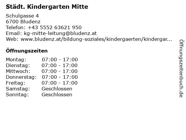 | Öffnungszeiten Städt. Kindergarten Mitte in Bludenz anzeigen | |