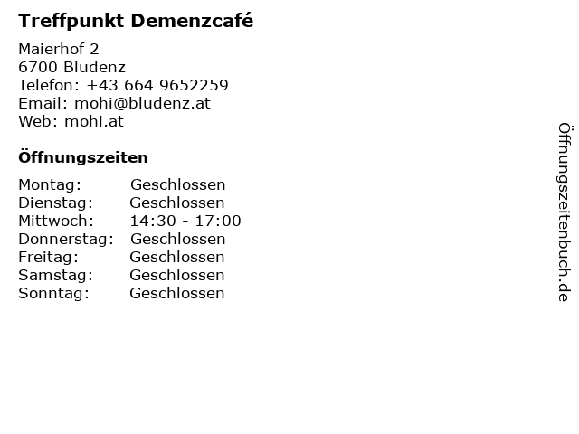 | Öffnungszeiten Treffpunkt Demenzcafé in Bludenz anzeigen | |