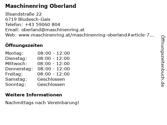 | Öffnungszeiten Maschinenring Oberland in Bludesch-Gais anzeigen | |