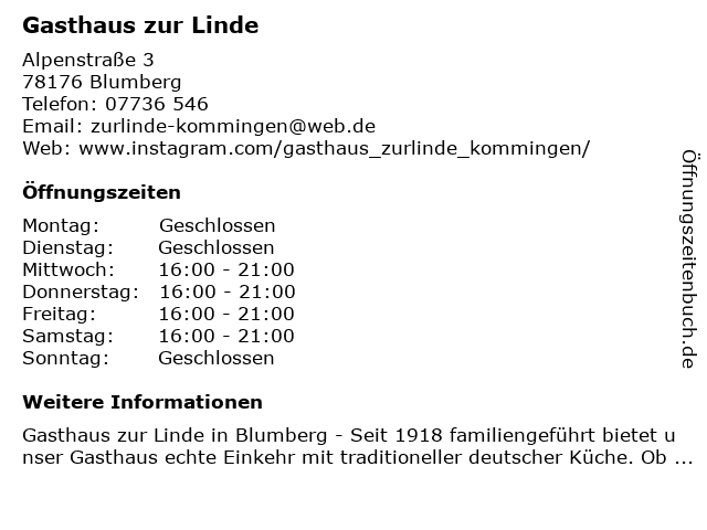 | Öffnungszeiten Gasthaus zur Linde in Blumberg anzeigen | |