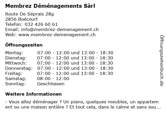 | Öffnungszeiten Membrez Déménagements Sàrl in Boécourt anzeigen | |