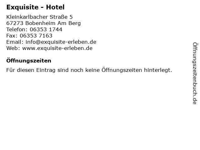 | Öffnungszeiten Exquisite - Hotel in Bobenheim Am Berg anzeigen | |