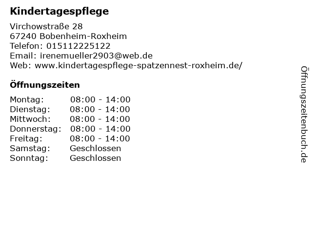 | Öffnungszeiten Kindertagespflege in Bobenheim-Roxheim anzeigen | |