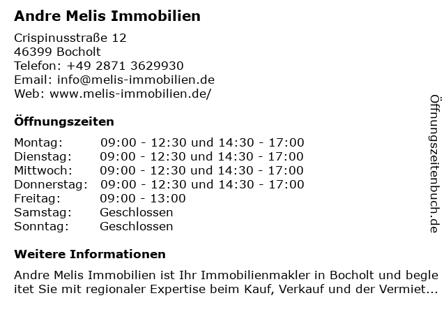 | Öffnungszeiten Andre Melis Immobilien in Bocholt anzeigen | |
