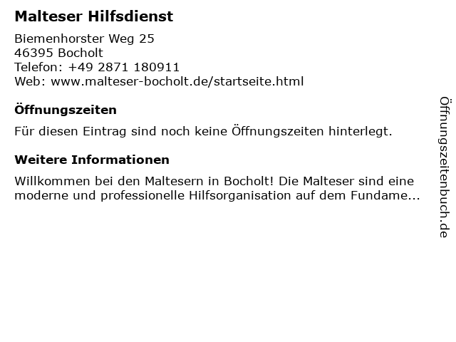 | Öffnungszeiten Malteser Hilfsdienst in Bocholt anzeigen | |