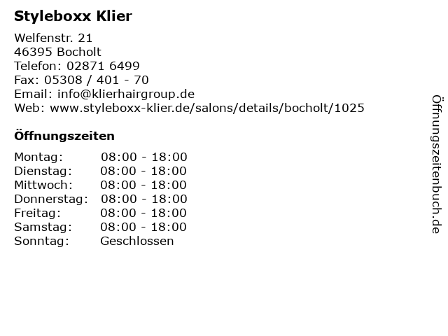 | Öffnungszeiten Styleboxx Klier in Bocholt anzeigen | |
