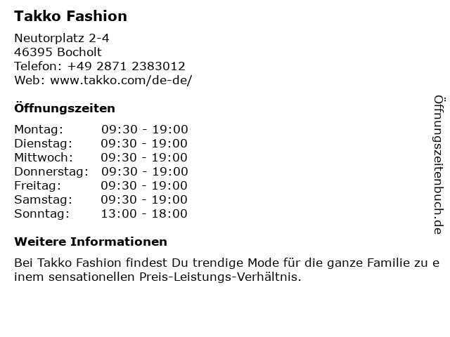 | Öffnungszeiten Takko Fashion in Bocholt anzeigen | |