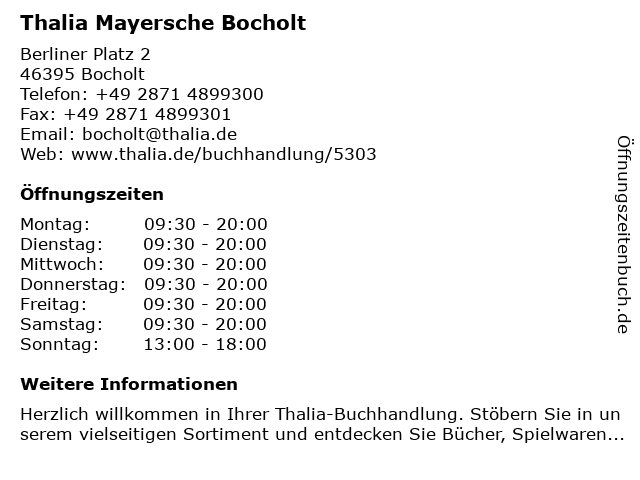 | Öffnungszeiten Thalia Mayersche Bocholt in Bocholt anzeigen | |