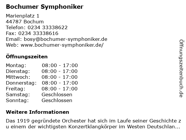 | Öffnungszeiten Bochumer Symphoniker in Bochum anzeigen | |