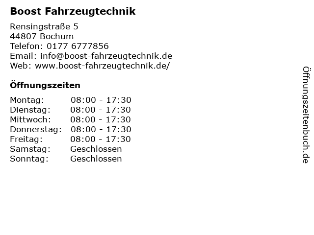 | Öffnungszeiten Boost Fahrzeugtechnik in Bochum anzeigen | |