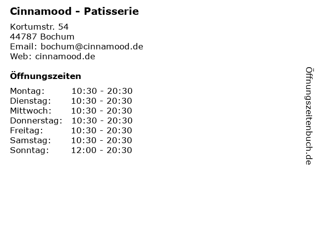| Öffnungszeiten Cinnamood - Patisserie in Bochum anzeigen | |