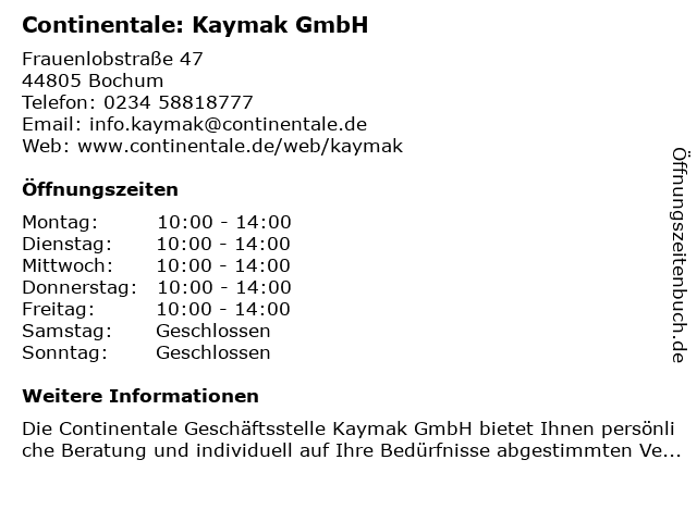 | Öffnungszeiten Continentale: Kaymak GmbH in Bochum anzeigen | |