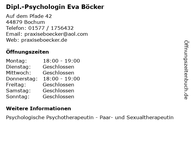 | Öffnungszeiten Dipl.-Psychologin Eva Böcker in Bochum anzeigen | |