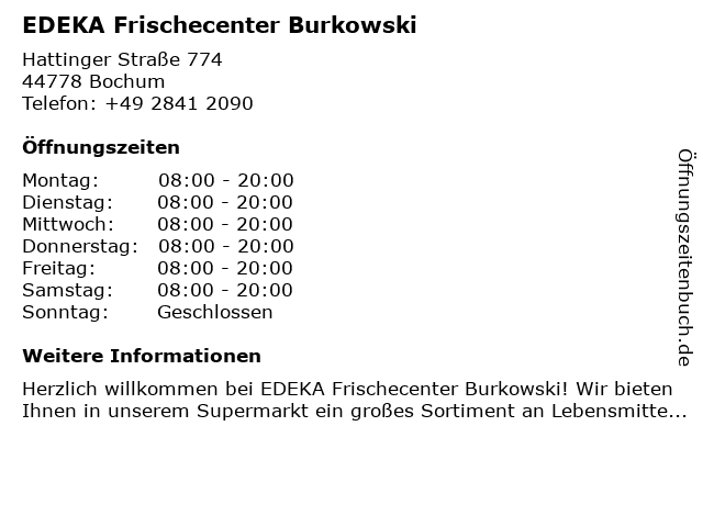 | Öffnungszeiten EDEKA Frischecenter Burkowski in Bochum anzeigen | |