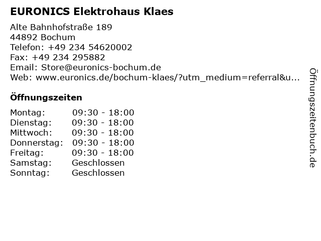 | Öffnungszeiten EURONICS Elektrohaus Klaes in Bochum anzeigen | |