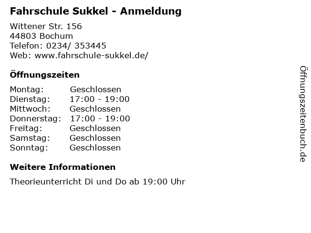 Öffnungszeiten Fahrschule Sukkel - Anmeldung in Bochum anzeigen | |