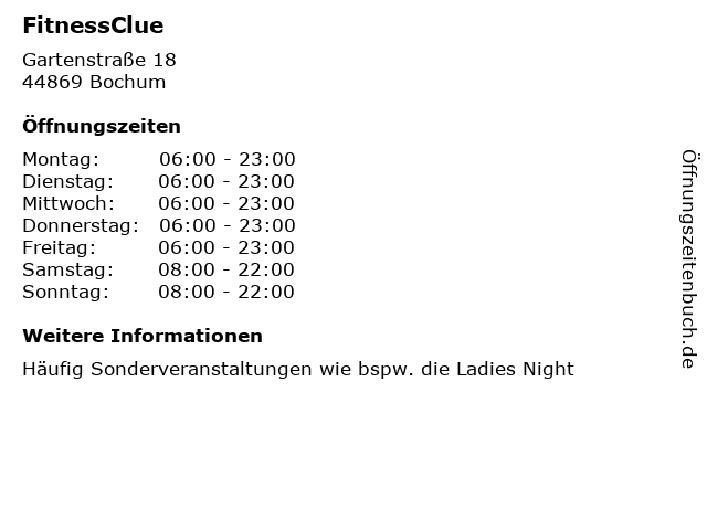 | Öffnungszeiten FitnessClue in Bochum anzeigen | |
