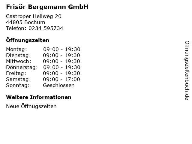 | Öffnungszeiten Frisör Bergemann GmbH in Bochum anzeigen | |