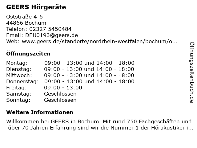 | Öffnungszeiten GEERS Hörgeräte in Bochum anzeigen | |
