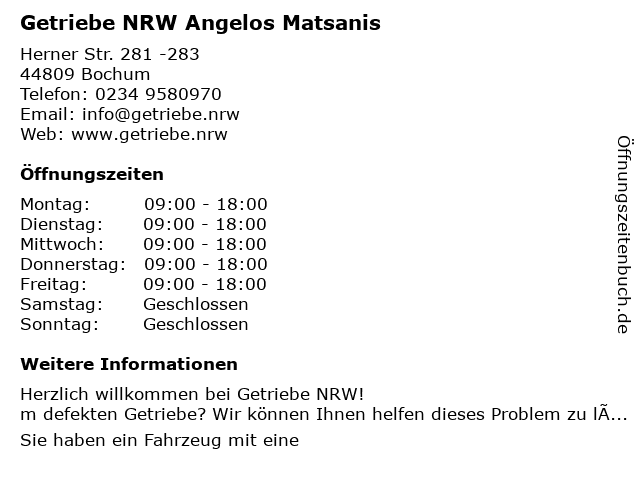 | Öffnungszeiten Getriebe NRW Angelos Matsanis in Bochum anzeigen | |