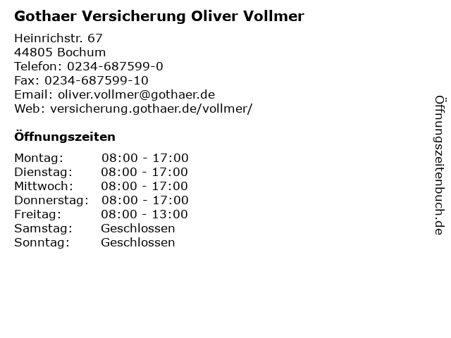 1 Gothaer Versicherung - Generalagentur Marcus Schulz (Entfernung: 0,01 km) Heinrichstr. 67, 44805 Bochum 5 M. Vollmer Fleischereifiliale & Partyserviceverk. (Entfernung: 7,00 km) Martener Str. 324, 44379 Dortmund 6 Schreibbüro Elke Vollmer Büro für Dienstleistungen (Entfernung: 9,58 km) Gelsenkircher Str. 191, 44651 Herne |