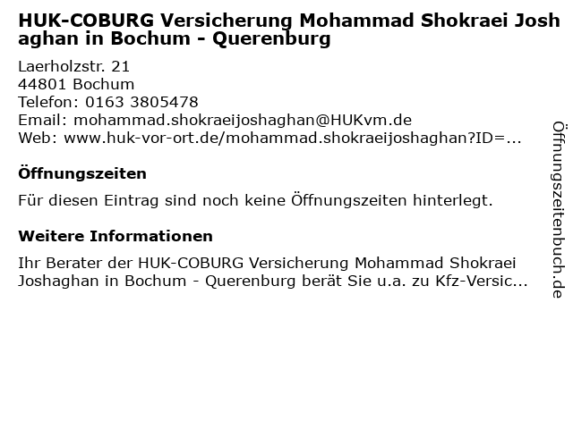 | HUK-COBURG Versicherung Mohammad Shokraei Joshaghan in Bochum - Querenburg anrufen | |
