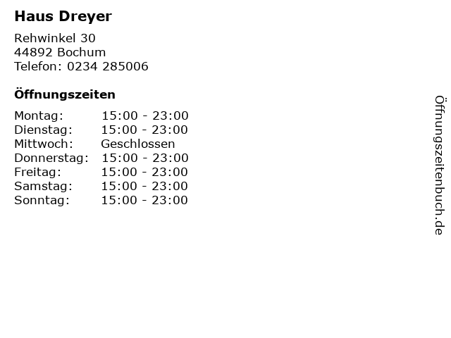 | Öffnungszeiten Haus Dreyer in Bochum anzeigen | |