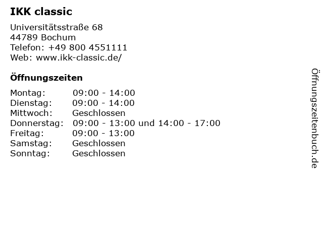 | Öffnungszeiten IKK classic in Bochum anzeigen | |