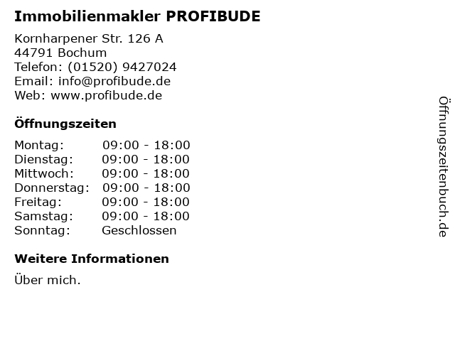| Öffnungszeiten Immobilienmakler PROFIBUDE in Bochum anzeigen | |