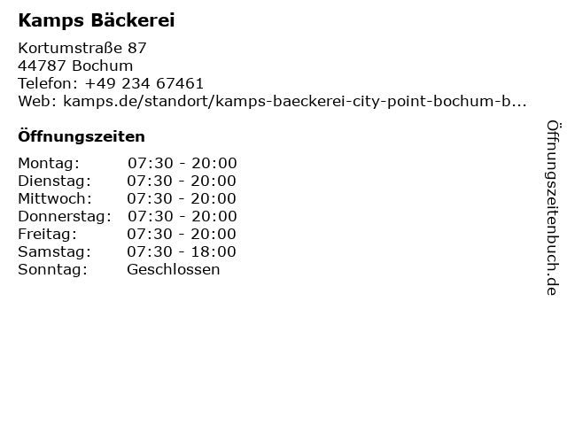 | Öffnungszeiten Kamps Bäckerei in Bochum anzeigen | |
