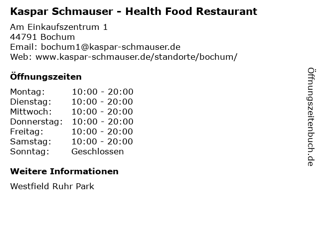 | Öffnungszeiten Kaspar Schmauser - Health Food Restaurant in Bochum anzeigen | |