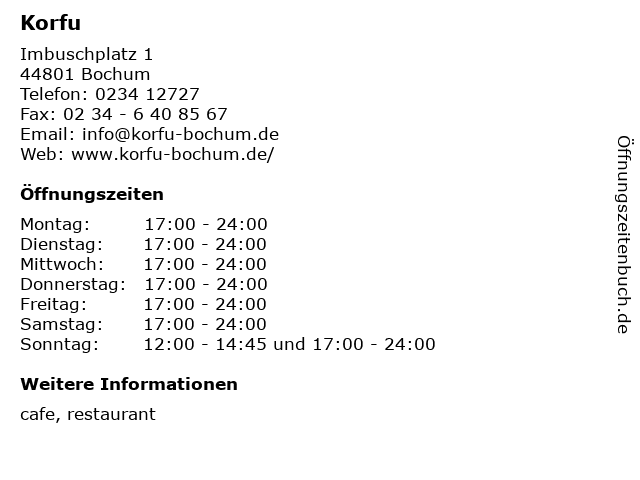 | Öffnungszeiten Korfu in Bochum anzeigen | |