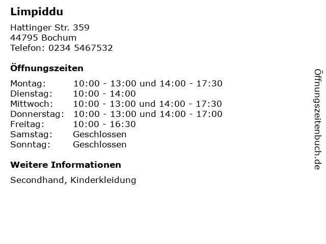 | Öffnungszeiten Limpiddu in Bochum anzeigen | |