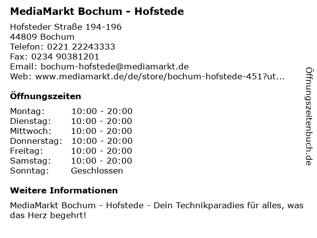 | Öffnungszeiten MediaMarkt Bochum - Hofstede in Bochum anzeigen | |