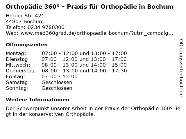 1 Orthopädie 360° - Praxis für Orthopädie in Bochum (Entfernung: 8,37 km) Universitätsstraße 142, 44799 Bochum 6 |