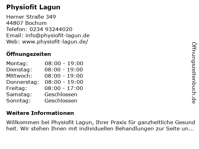 | Öffnungszeiten Physiofit Lagun in Bochum anzeigen | |