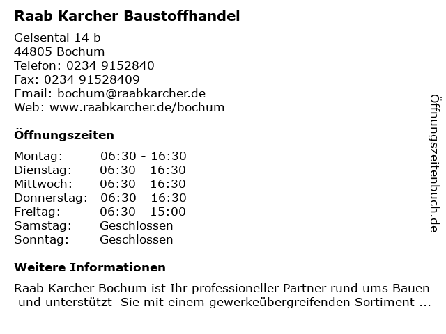 | Öffnungszeiten Raab Karcher Baustoffhandel in Bochum anzeigen | |