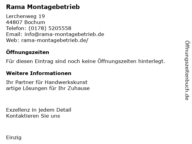 | Öffnungszeiten Rama Montagebetrieb in Bochum anzeigen | |
