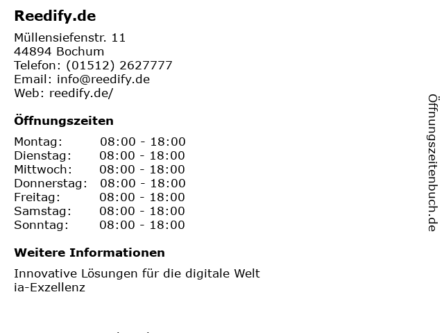 | Öffnungszeiten Reedify.de in Bochum anzeigen | |