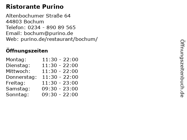 | Öffnungszeiten Ristorante Purino in Bochum anzeigen | |
