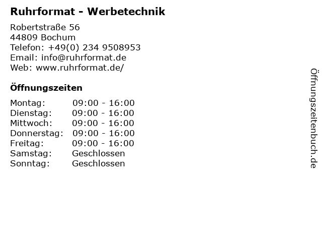 | Öffnungszeiten Ruhrformat - Werbetechnik in Bochum anzeigen | |