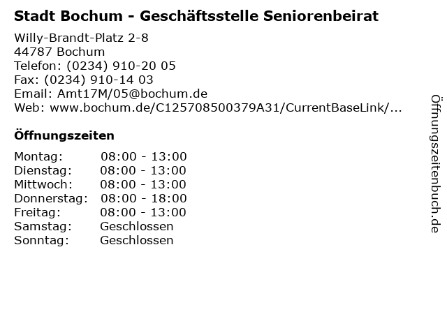 Branchen & Suchbegriffe zu Stadt Bochum - Geschäftsstelle Seniorenbeirat:amt, büro, gemeinde, geschäftsstelle, kreis, markt, rathaus, seniorenbeirat, stadt, verwaltung |